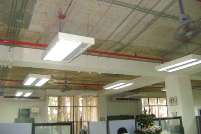 ไฟฟ้าส่องสว่างภายในสำนักงานของคณะใช้หลอดไฟฟ้าชนิด ฟลูออเรสเซ้นส์ ขนาด 40 วัตต์จำนวน 32 หลอด ต้องใช้ไฟฟ้าประมาณ 1,300 วัตต์ต่อชั่วโมง เนื่องจากตำแหน่งแผงโซล่าเซลล์และตำแหน่งการติดตั้งของระบบแปลงไฟฟ้าจากไฟกระแสตรงเป็นกระแสสลับอยู่ห่างจากหลอดไฟมากดังนั้นจึงออกแบบระบบเท่า คือ 2,600 วัตต์ ระบบนี้ได้ออกแบบระบบผลิตไฟฟ้ากระแสตรง 48 โวลล์ และใช้เครื่องแปลงไฟจาก 48 โวลล์ เป็นกระแสสลับ 220 โวลล์ ขนาด 2,600 วัตต์ แผงโซล่าเซลล์ผลิตไฟฟ้าใช้ชนิดแบบผลึก (อายุการใช้งานมากกว่า 25 ปี) ขนาด 130 วัตต์ จำนวน 20 แผง โดยแบ่งระบบชาร์ทเป็นสองส่วน คือส่วนหลัก และสำรอง (หากระบบหนึ่งระบบใดไม่สามารถทำงานได้ยังมีระบบสำรองซึ่งจะทำให้ระบบโซล่าเซลล์ยังสามารถทำงานได้) โดยทั้งระบบหลักและระบบสำรองจะทำงานพร้อมกันในสภาวะการทำงานปรกติ ภาคการเก็บประจุใช้แบตเตอรี่ชนิด Deep cycle battery ซึ่งจะสามารถเก็บและค่ายประจุได้มากกว่าแบตเตอรี่รถยนต์ จำนวน 26 KAmp. สำหรับระบบการเชื่อมต่อกับไฟฟ้าเพื่อจ่ายให้กับโหลดป็นแบบ Manual โดยใช้สวิทย์แบบ 3 ทางเป็นตัว ตัด-ต่อระหว่างไฟฟ้าปรกติ กับ ไฟฟ้าที่ผลิตจากพลังงานแสงอาทิตย์